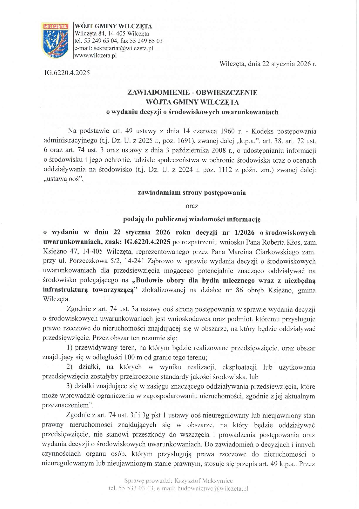 ZAWIADOMIENIE - OBWIESZCZENIE WÓJTA GMINY WILCZĘTA o wydaniu decyzji o środowiskowych uwarunkowaniachdla przedsięwzięcia polegającego na „Budowie obory dla bydła mlecznego wraz z niezbędną infrastrukturą towarzyszącą” zlokalizowanej na działce nr 86 obręb Księżno, gmina Wilczęta